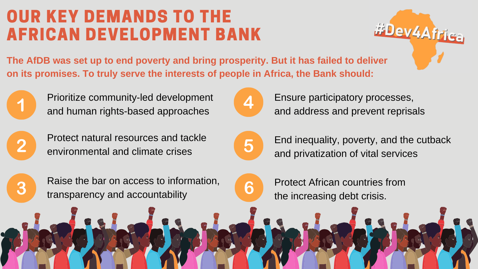 The participants of the civil society strategy session are calling on the AfDB to do the following: