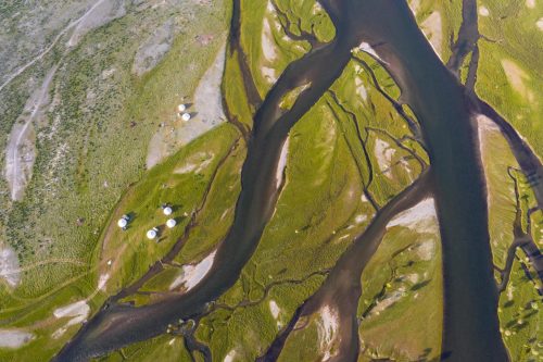 Aerial view, yurts of mongolian nomads at the Khovd river. Bayan-Ulgii province. Mongolia. Credit: Erdenebulgan Battsengel